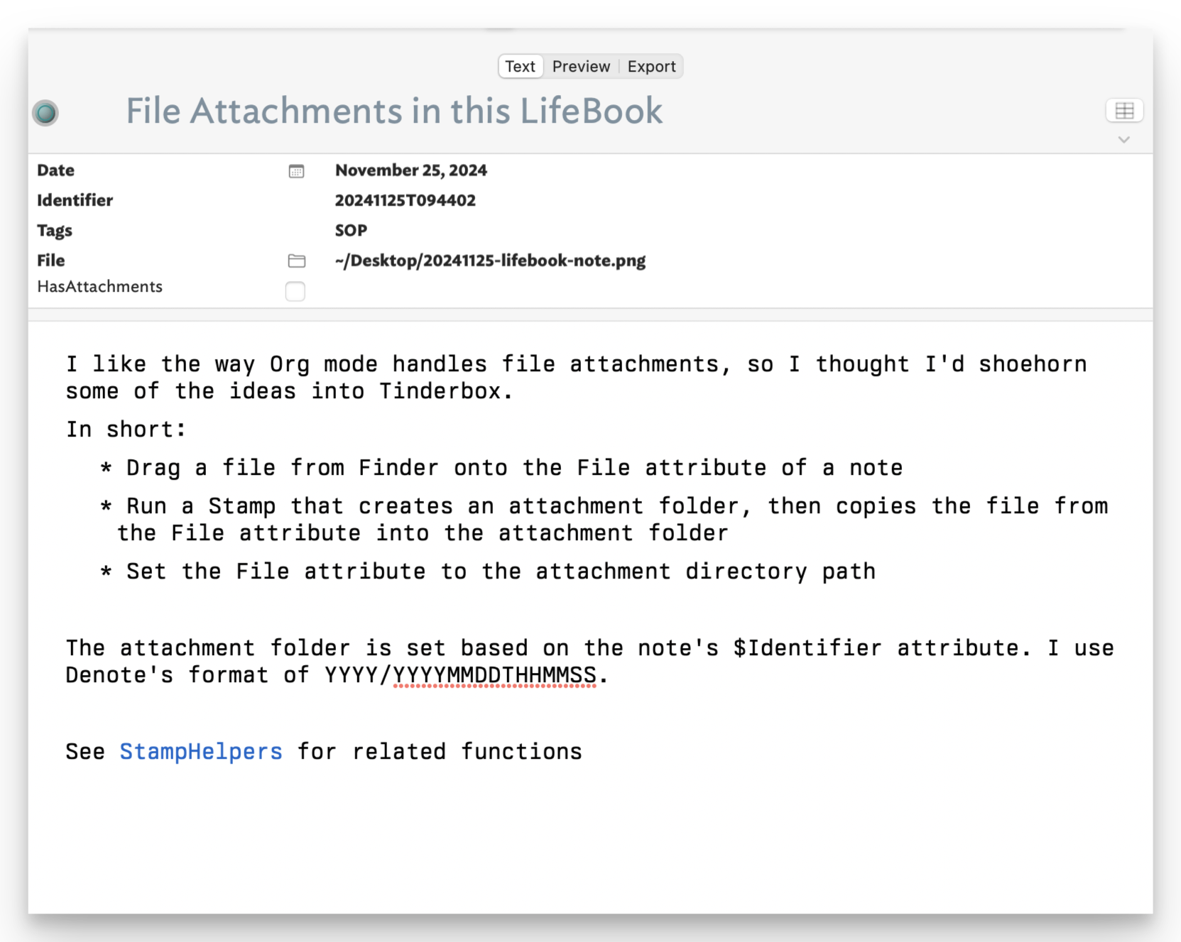 Tinderbox, on the other hand, isn't much help out of the box with files. It has lots of file-based tooling, but the idea of managing attachments isn't one of them. So, I'm trying to finagle Tinderbox into working the way Emacs does.