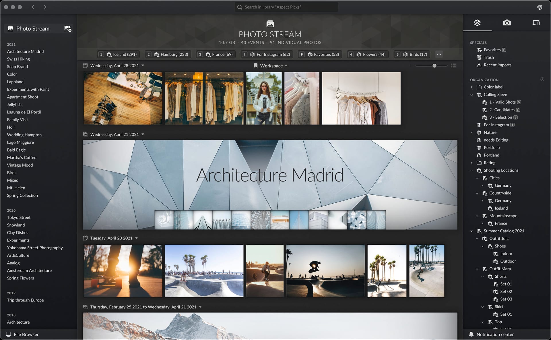 There are collections and smart collections. There are metadata filters for labels and ratings. All table stakes so far.