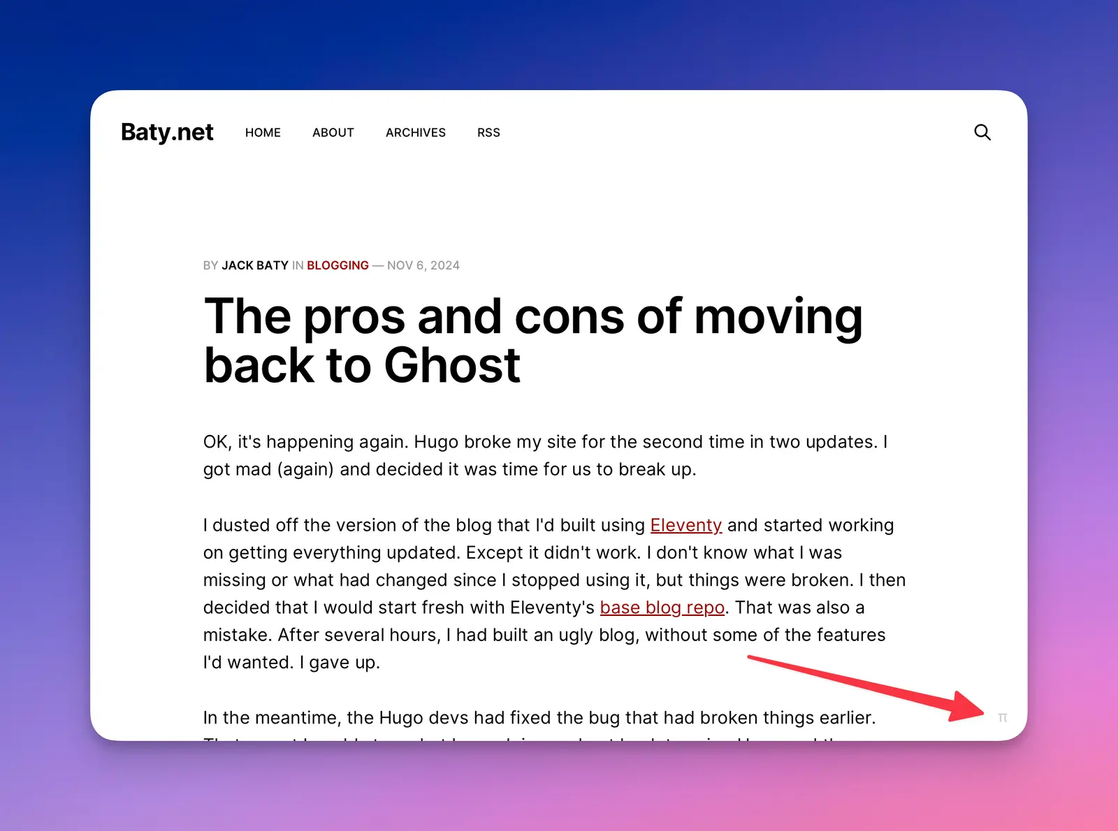 Now, at the bottom right of every post and page, there's a subtle π link that takes me directly to that content in Ghost's control panel. I've already used it several times this morning.