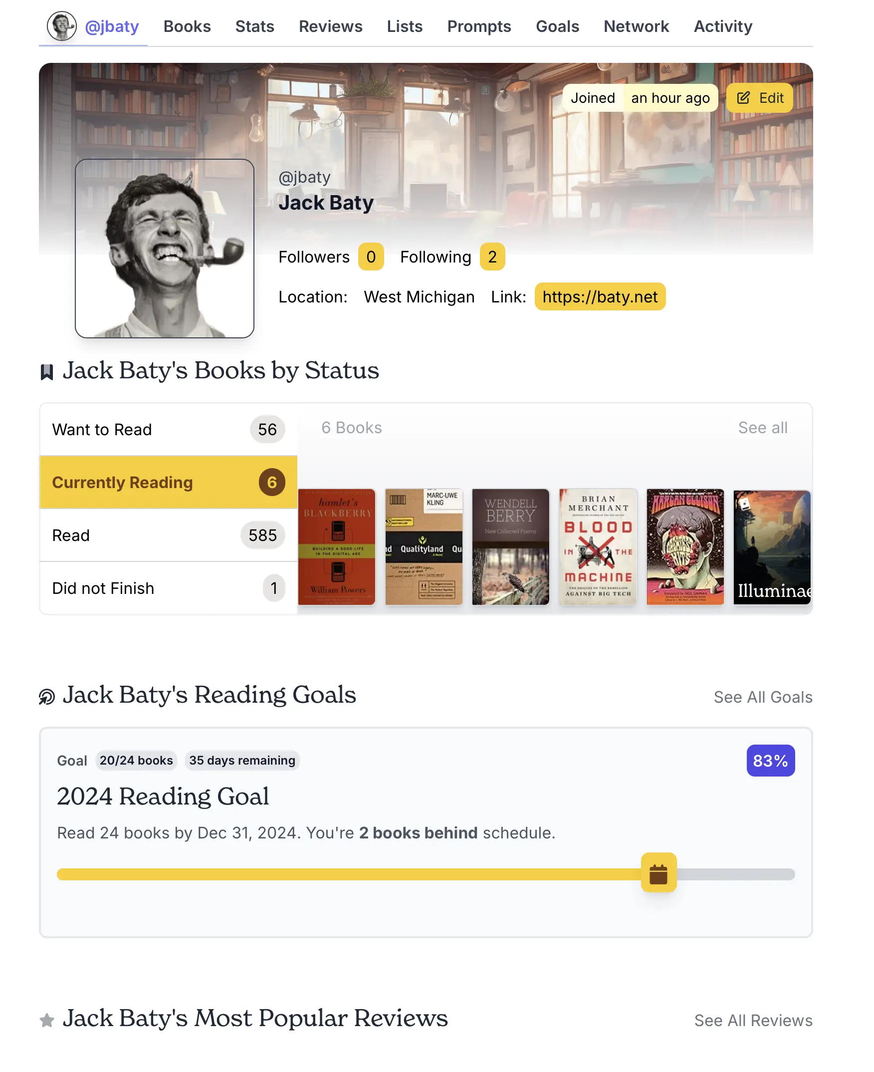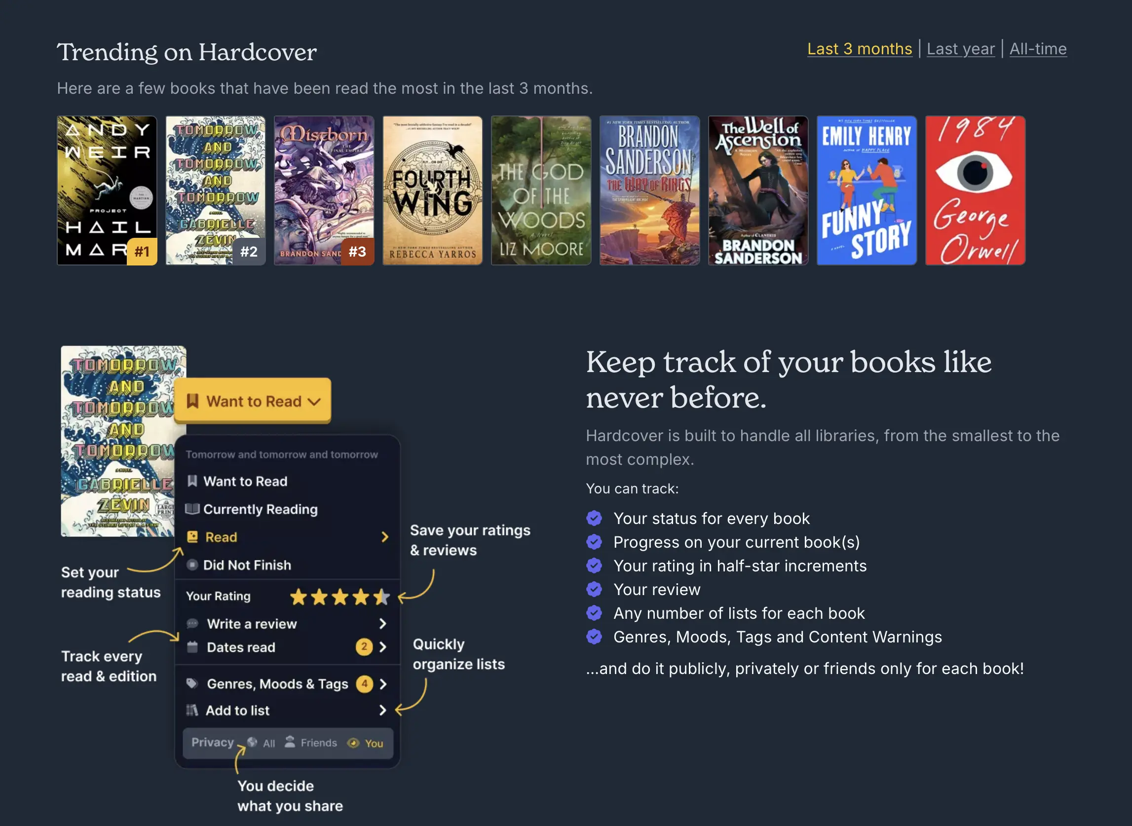 What I like about it is that I can get to the books and lists that I want without too much fuss. StoryGraph was bad at this. Mostly, Hardcover shows me the things I want to see, where I expect to see them, so that's good.