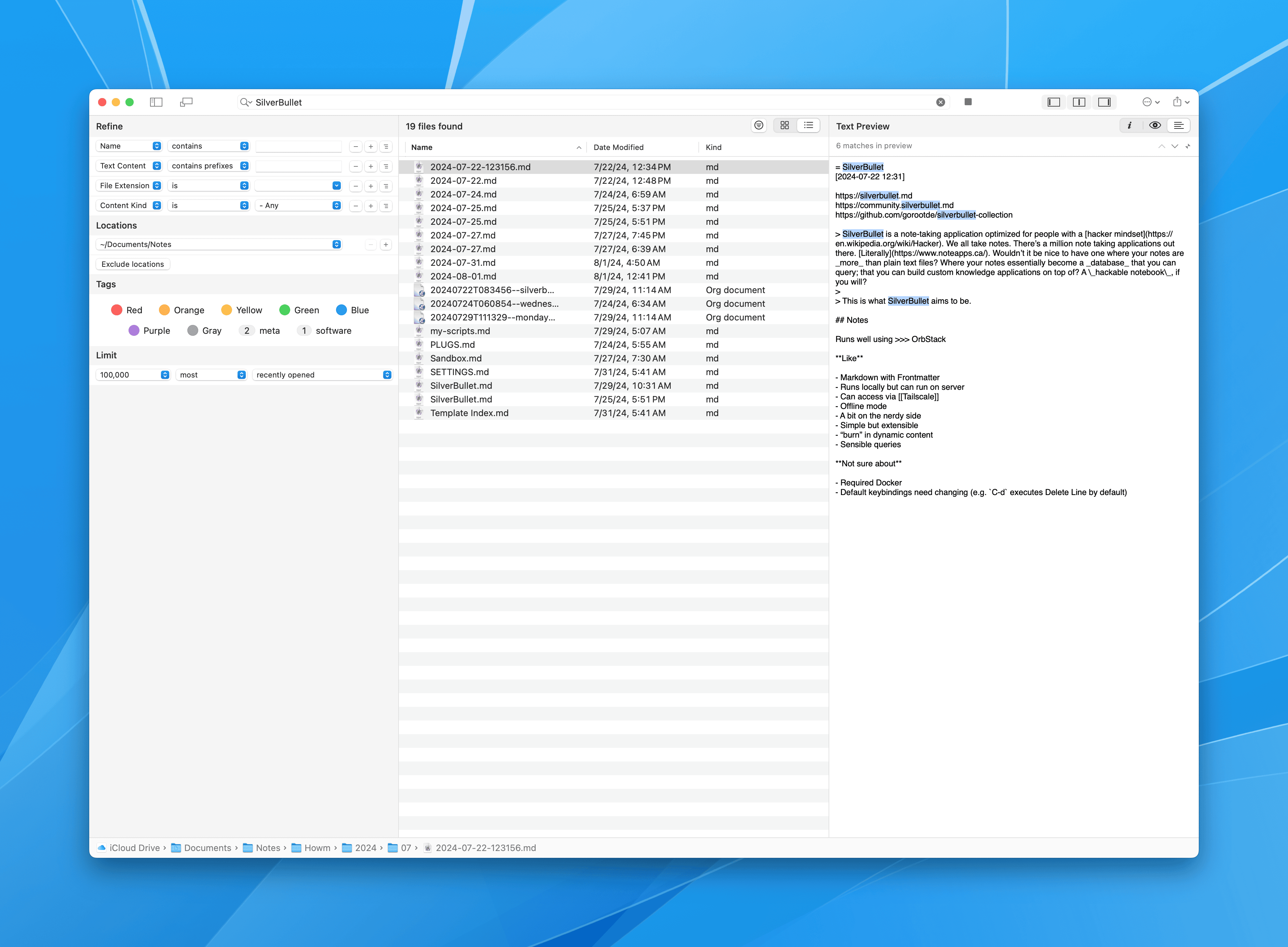 You'll notice SilverBullet in there, my newest infatuation. But here's the trick, I just point the default target for HoudahSpot searches at the enclosing Notes/ folder, and I can find most anything right away.