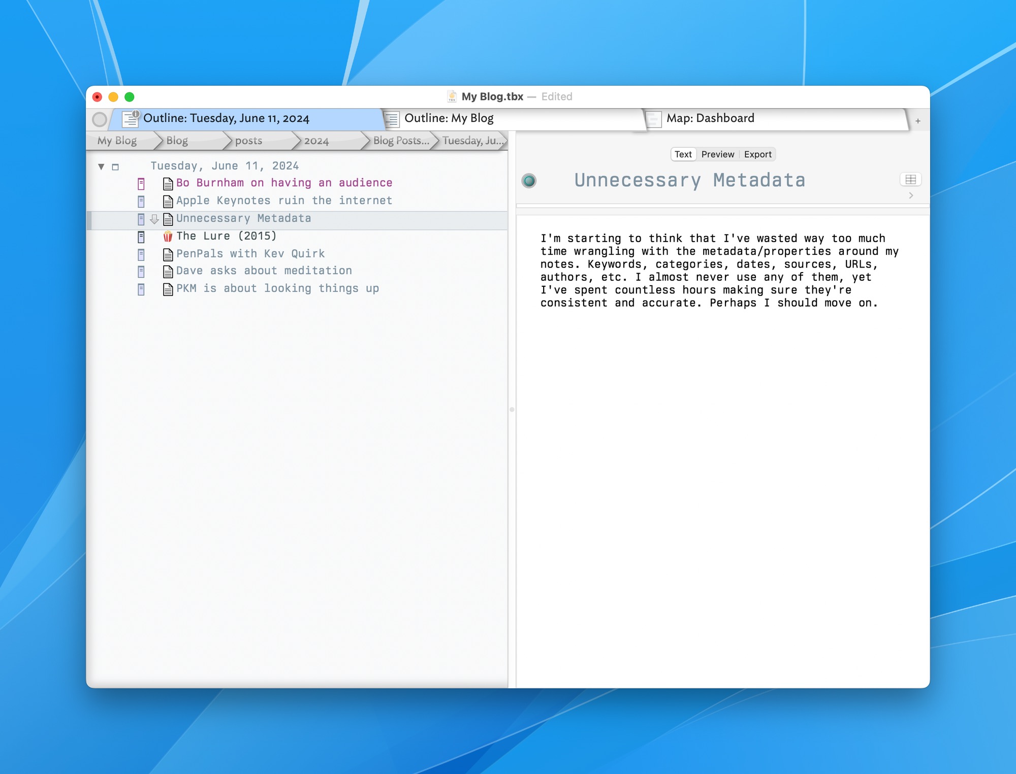 You'll note that this means I am restricted to apps that allow me to configure where notes are kept and that they're kept in some form of plain text. That covers most of my tools. I had been using DEVONthink for this, but it's been giving me trouble lately so I'm looking at simpler options. I'm digging it.