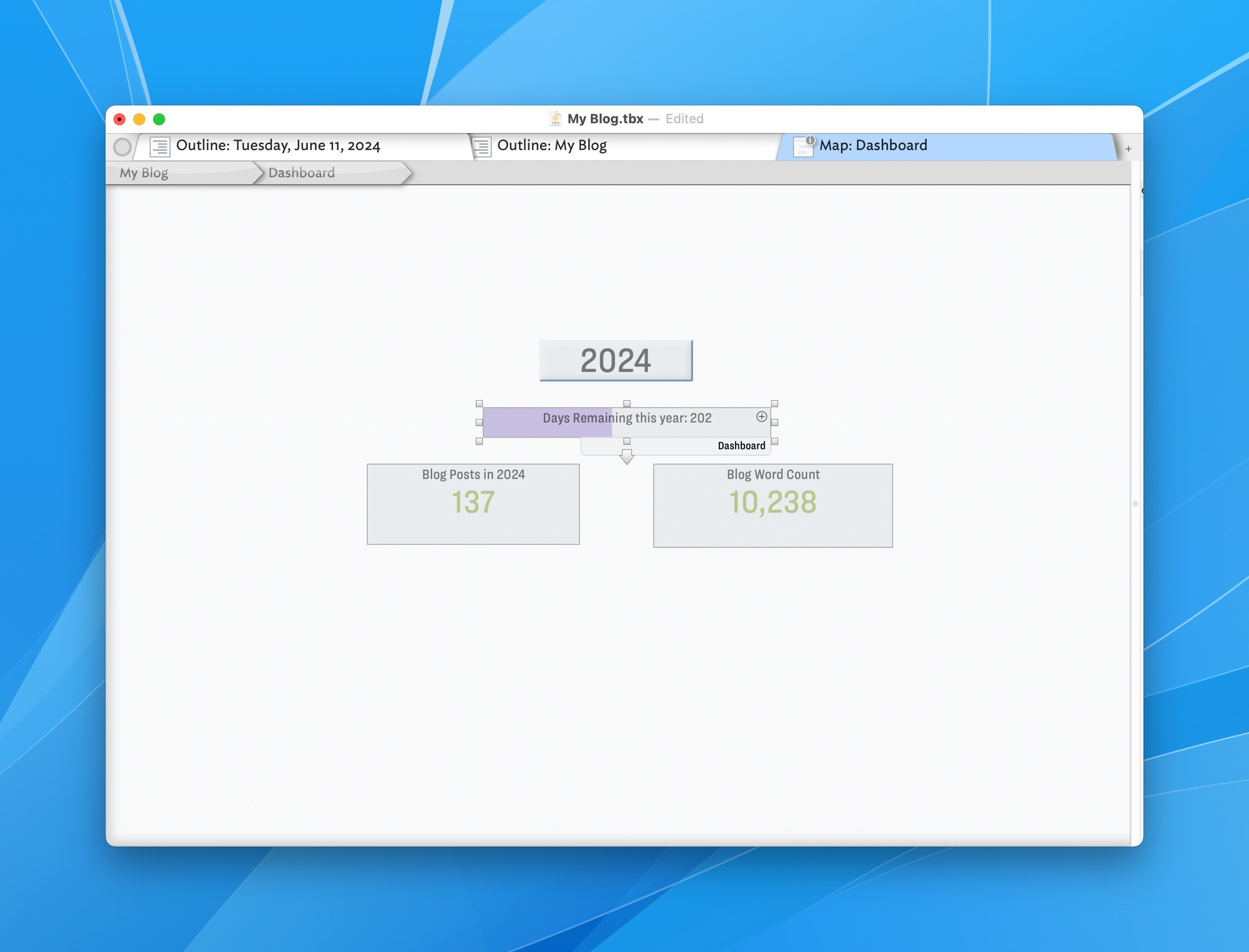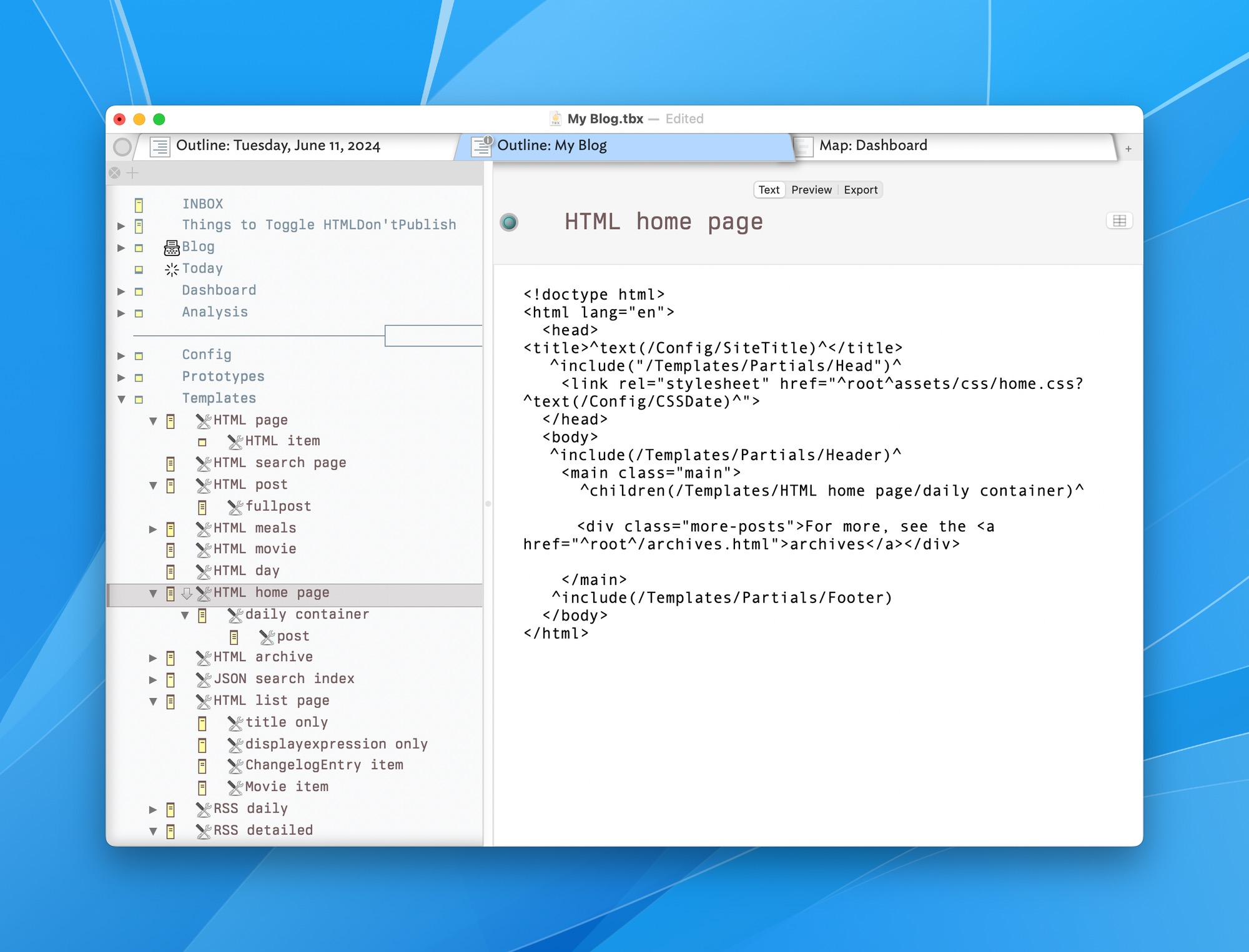 The blog's Tinderbox document is an outline organized by year/month/day/note. It contains all the HTML/CSS for rendering the site. It contains scripts for grabbing the daily weather forecast and for publishing and deploying the site. It's kind of crazy when you think about it.