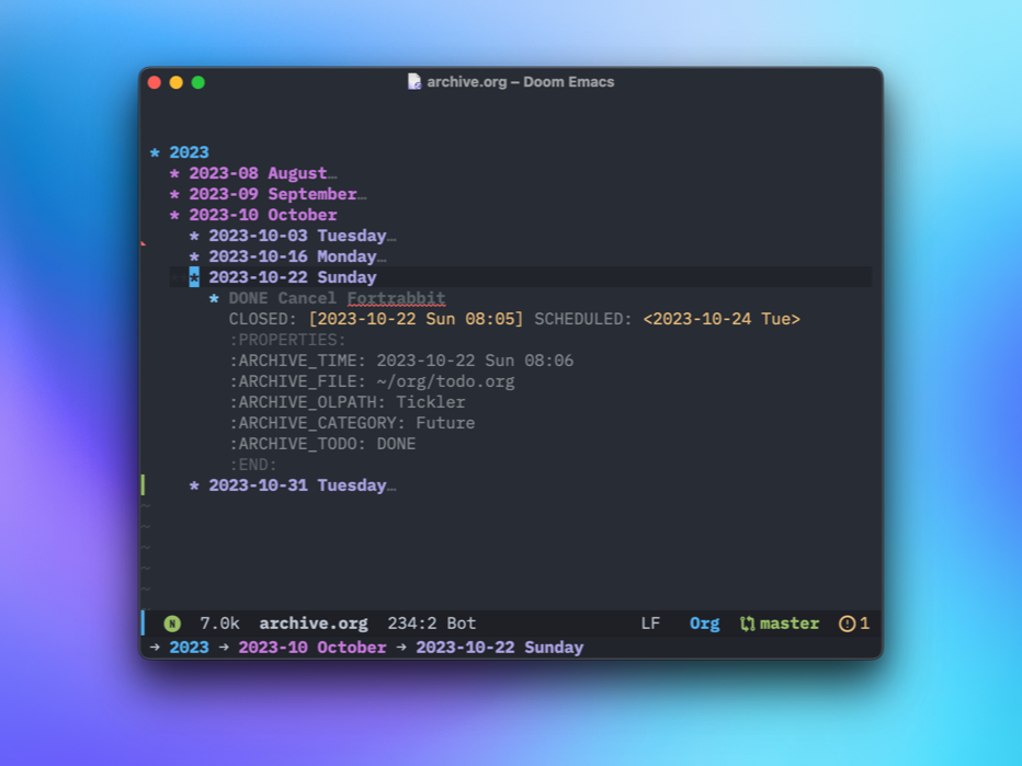 Now, everything I archive goes into a single Org file, organized by date within an Org date tree[1], like so: