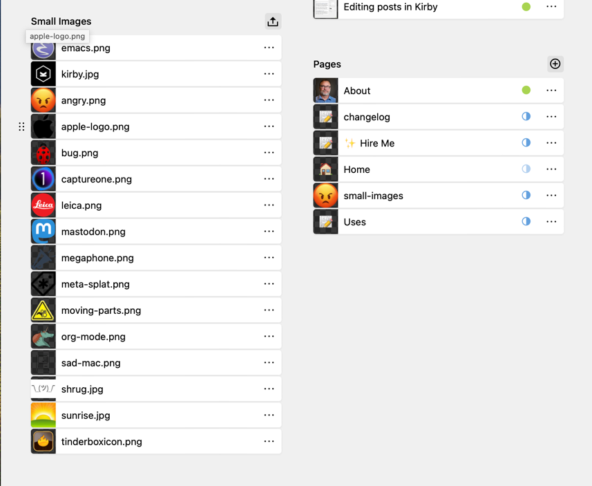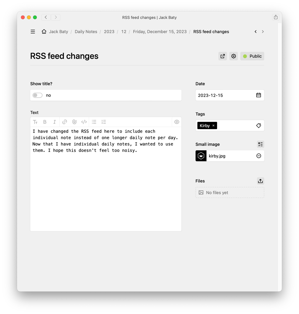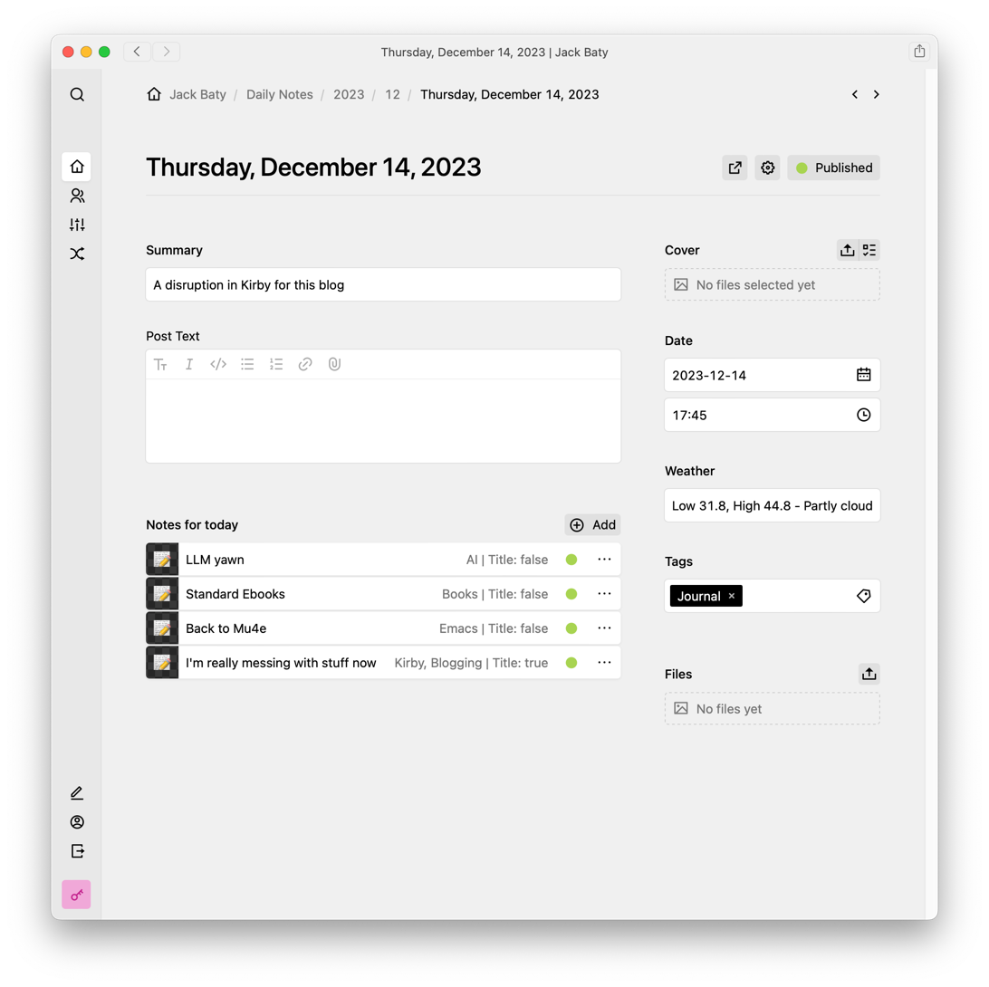 When I began using Tinderbox to build my Daily Notes blog, I reimplemented most of my favorite features from Fargo. The big one was the daily container of notes. Another was the small icon shown on the right of individual posts. I now have both of these here at baty.net, using (link: https://getkirby.com/ text: Kirby).
