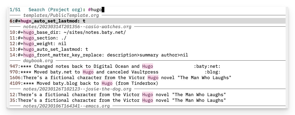 This morning I wanted to make a note about my Kobo eReader. I didn’t yet have a Denote note about it so I started a new one in Emacs and started typing. It occurred to me that maybe I’d already written about it. Of course I had. This happens a lot.