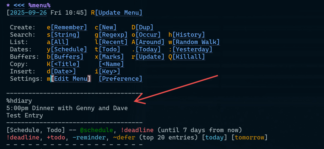 Howm has a handy menu for viewing tasks and notes. One thing I wanted to add was my Emacs diary entries for the current date. This took 3 things: