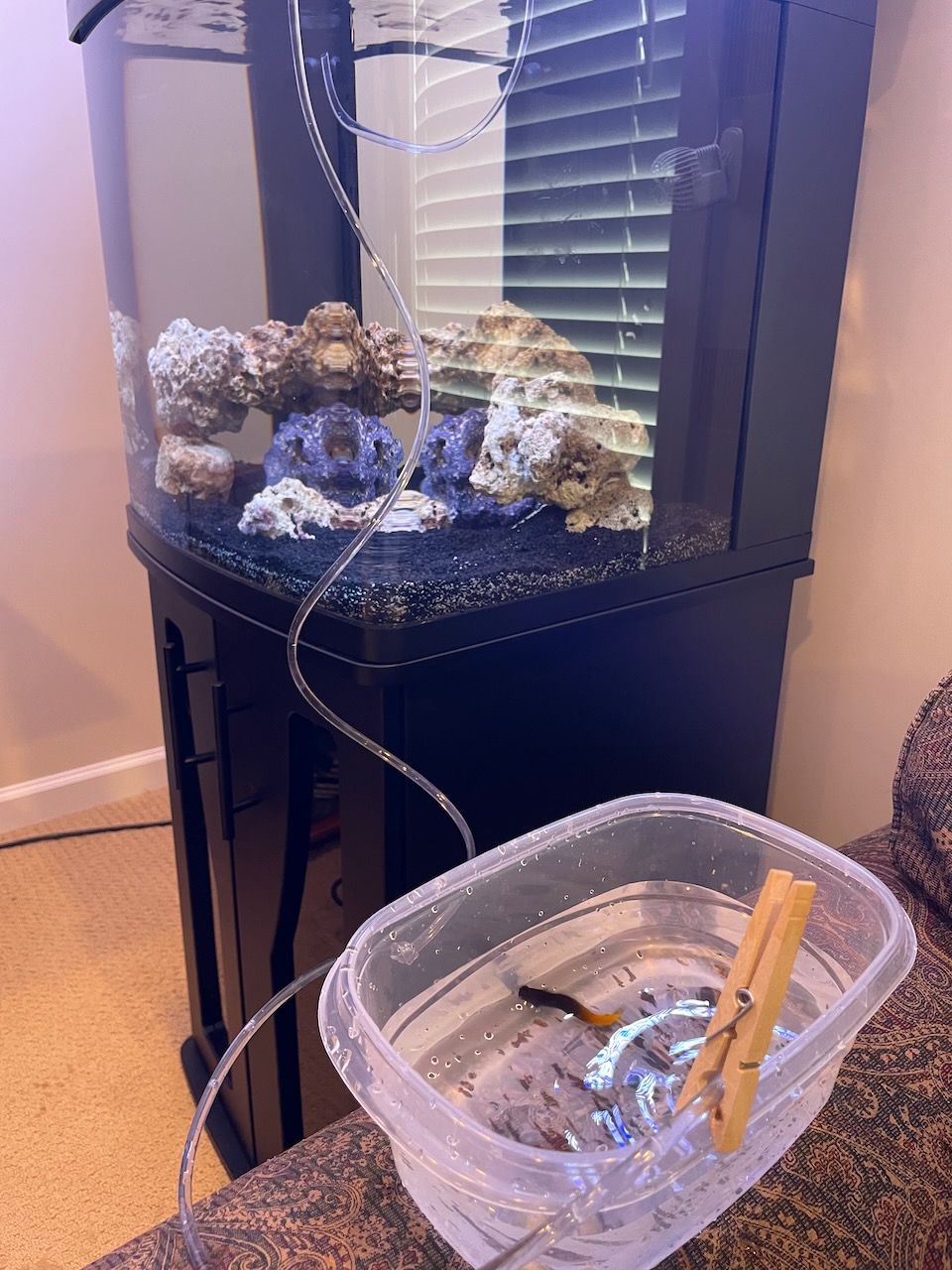 I haven’t taken a photo of him yet because he’s still hiding in a hole on the rocks. I did take a snap while acclimating him. Acclimation involves slowly dripping water from the aquarium into his water from the local fish store (Water Colors Aquarium Gallery)