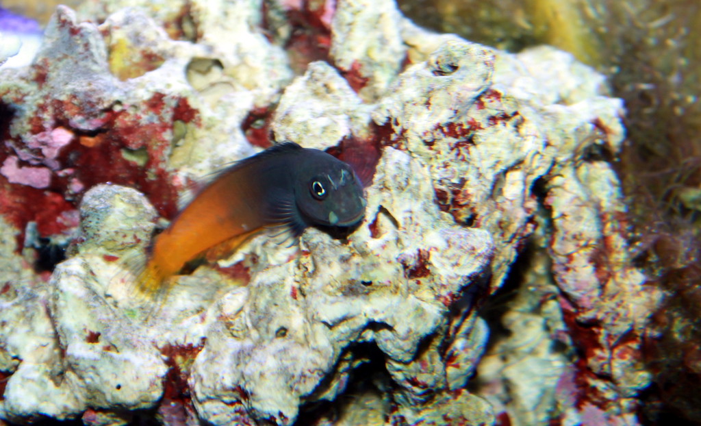 Isn’t he cute! (All clowns are born male…and cute). Since Marcus seemed to be doing well, I added another fish yesterday: A Bicolor Blenny. We named this one “Benny”. (I know).