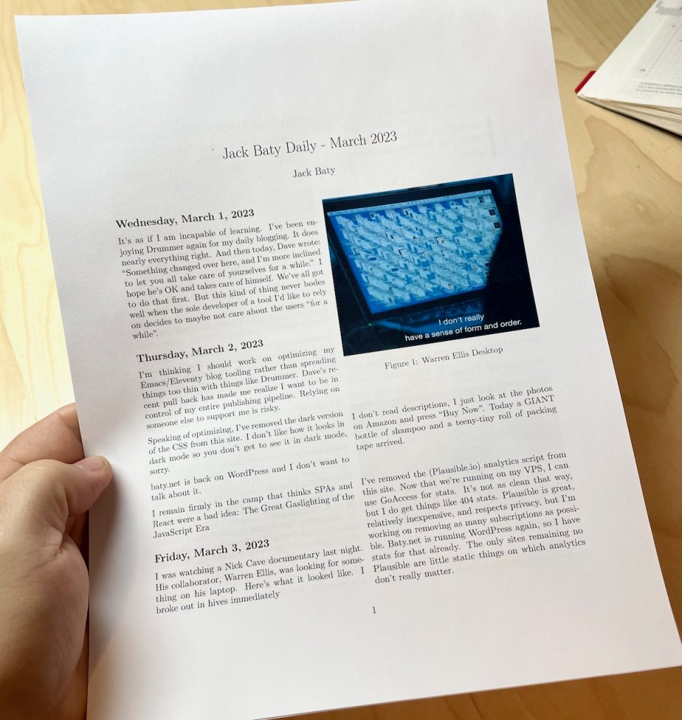 It occurred to me that my daily.baty.net website content is just a bunch of markdown files that could be treated the same as my org-journal files and perhaps printed as well.