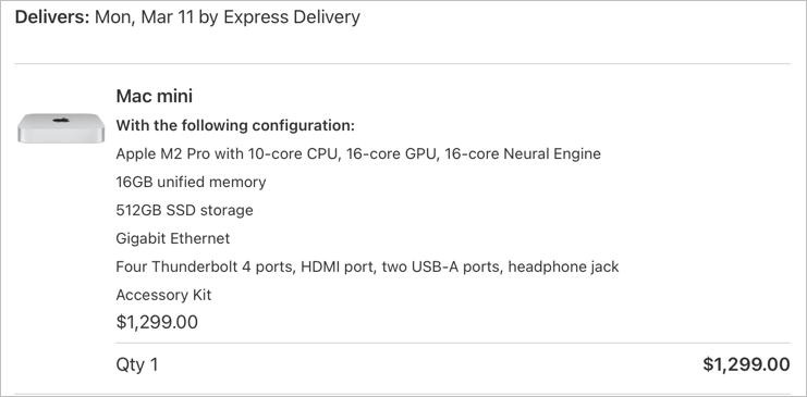 Since 2021, I’ve had an over-spec’ed MacBook Pro (M1 Max) with a 2TB internal drive and 32GB of RAM. I don’t do much that requires all of that oomph, but I figured it was nice to have anyway. With the Mini, I went with the Pro version mostly for the additional ports. A smaller, 512GB internal drive should be fine, since I’ll have a number of fast SSDs always attached. I’m not worried about not having enough room for my stuff. The thing I’m most worried about is “only” 16GB RAM. I’ve had 32GB for so long that I don’t remember what it was like working with less. I’m almost certain that 16GB will be plenty for my purposes, but it still makes me a little twitchy. Plus, $1,299 still feels like relatively cheap compared to the $3k+ I spent on the MBP.