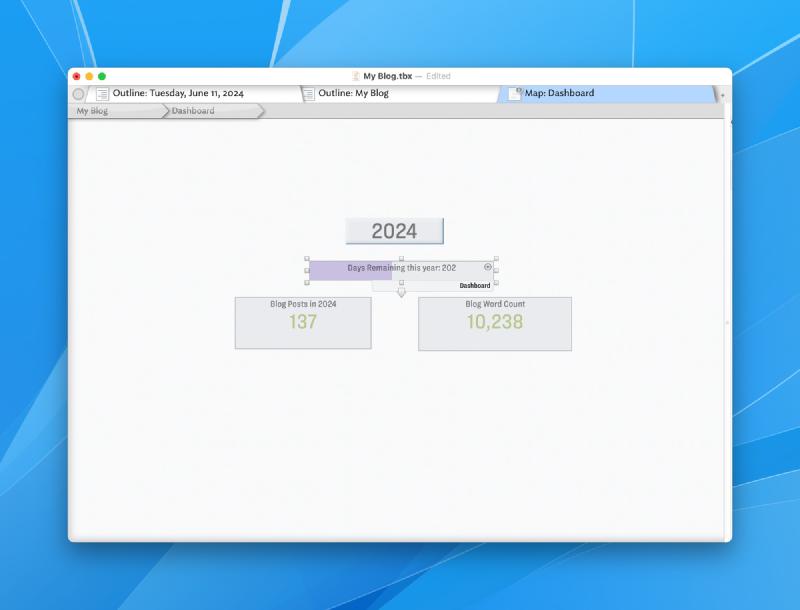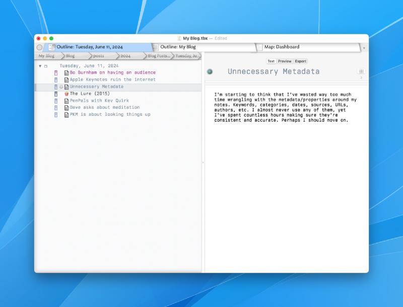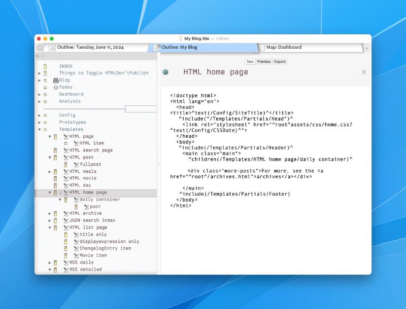The blog’s Tinderbox document is an outline organized by year/month/day/note. It contains all the HTML/CSS for rendering the site. It contains scripts for grabbing the daily weather forecast and for publishing and deploying the site. It’s kind of crazy when you think about it.
