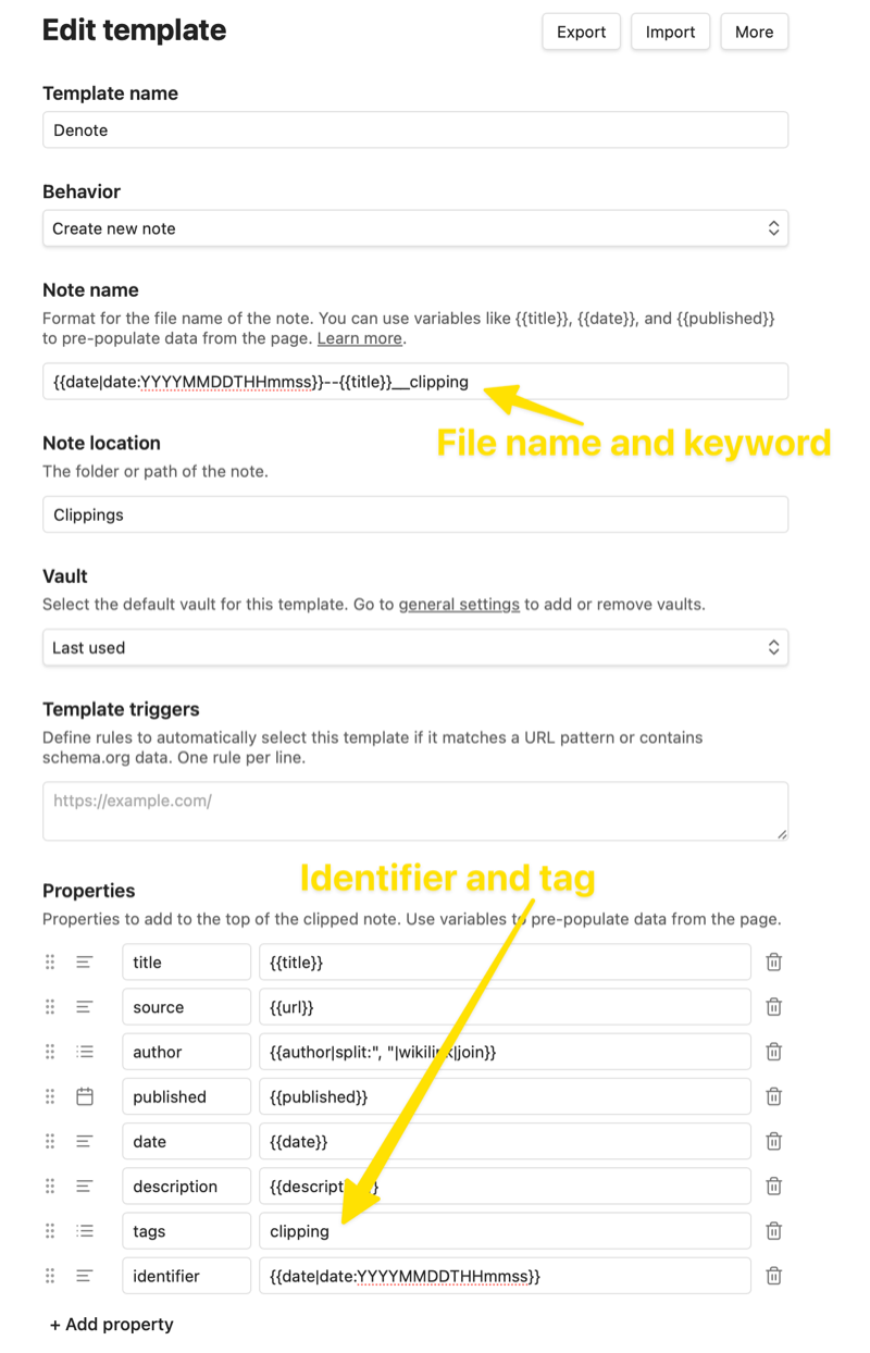 - Tweak the web clipper to save files using Denote's format and front matter