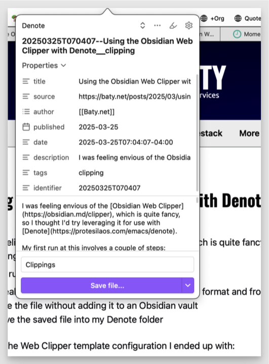 OK, so now after using the Web Clipper, I get a Markdown file[1]with a (mostly) Denote-compatible file name and front matter in my ~/Downloads folder. Here's what clipping this post looks like: