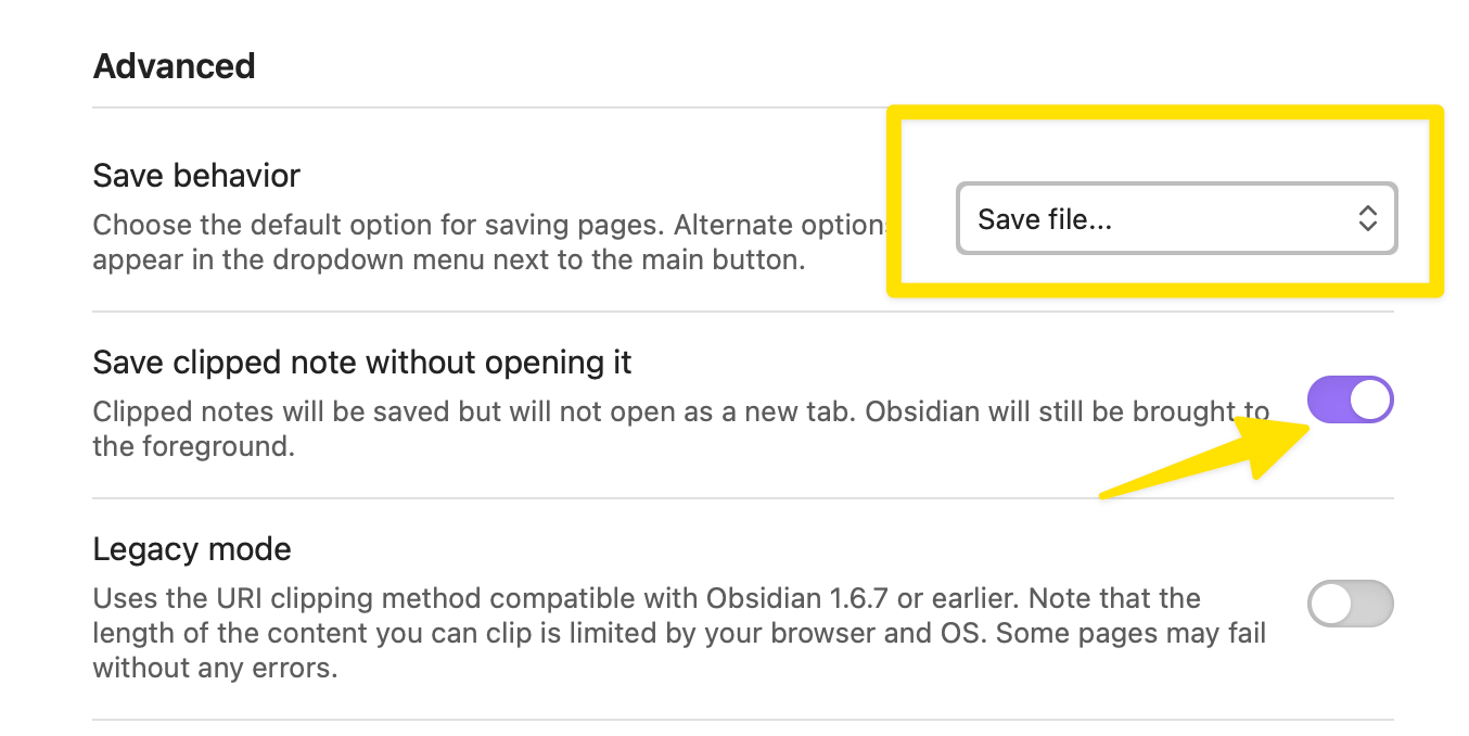 In the Web Clipper's advanced settings, I set the behavior to "Save file..." rather than "Add to Obsidian".