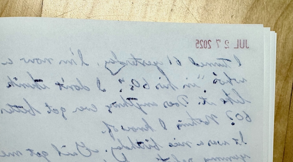 The idea was to use it for free-form morning writing. I grabbed a couple of my favorite pens, loaded with my favorite ink, and wrote a couple of pages. Then I looked on the reverse of one of those pages, and saw this mess:
